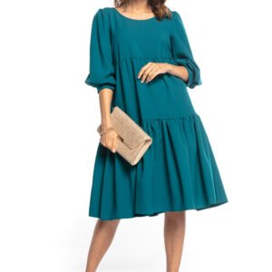 Sukienka z bufiastym rękawem 3/4 i dekoltem w łódkę. Sukienka wykonana z falbanek o rozkloszowanym kroju. Projekt z pewnością zakryje wszelkie potencjalne niedoskonałości ciała i nie ograniczy ruchu. Z tyłu głęboki dekolt.