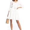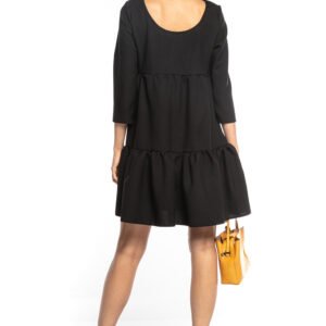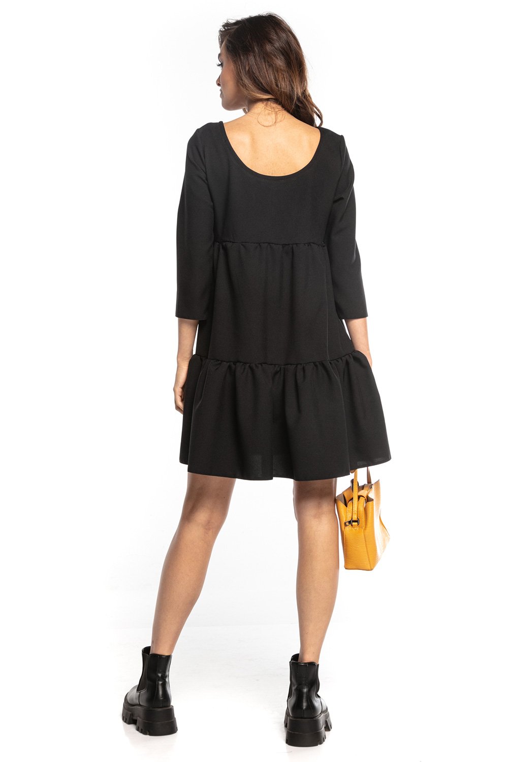 Sukienka mini z rękawem 3/4 i dekoltem w łódkę. Sukienka wykonana z falbanek o rozkloszowanym kroju. Projekt z pewnością zakryje wszelkie potencjalne niedoskonałości ciała i nie ograniczy ruchu. Z tyłu głęboki dekolt.