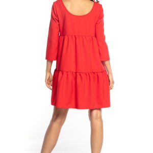 Sukienka mini z rękawem 3/4 i dekoltem w łódkę. Sukienka wykonana z falbanek o rozkloszowanym kroju. Projekt z pewnością zakryje wszelkie potencjalne niedoskonałości ciała i nie ograniczy ruchu. Z tyłu głęboki dekolt.