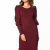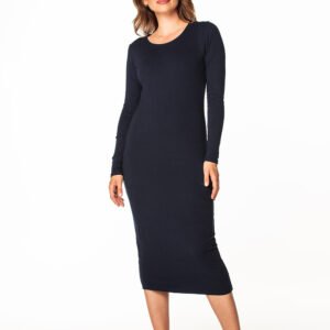 Długa, dopasowana i prosta sukienka z dzianiny bawełnianej z dekoltem w łódkę i długim rękawem.
