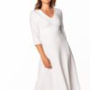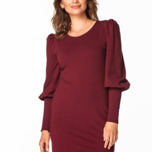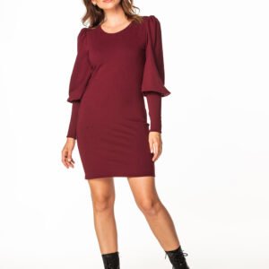 Dzianinowa sukienka mini z dekoltem w łódkę i długimi bufiastymi rękawami wykończonymi podwójnym mankietem.