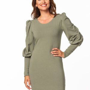 Dzianinowa sukienka mini z dekoltem w łódkę i długimi bufiastymi rękawami wykończonymi podwójnym mankietem.