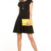 Dzianinowa sukienka midi za kolano z dekoltem w łódkę i długimi bufiastymi rękawami wykończonymi podwójnym mankietem.