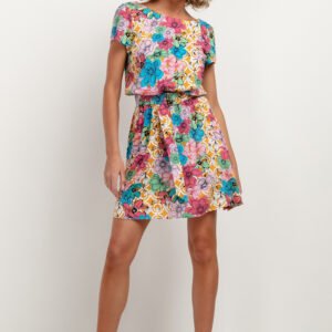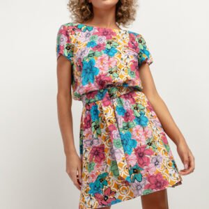 Piękna sukienka to świetna propozycja do zarówno eleganckich jak i codziennych stylizacji. Góra sukienki ma luźny fason, typu kimono i lekko rozkloszowany dół z długością przed kolano. Piękne, kwieciste wzory i głęboko wycięty dekolt w kształcie V z tyłu przyciągają uwagę, a wiązany pasek ze złotą sprzączką podkreśla talię.