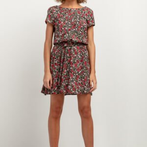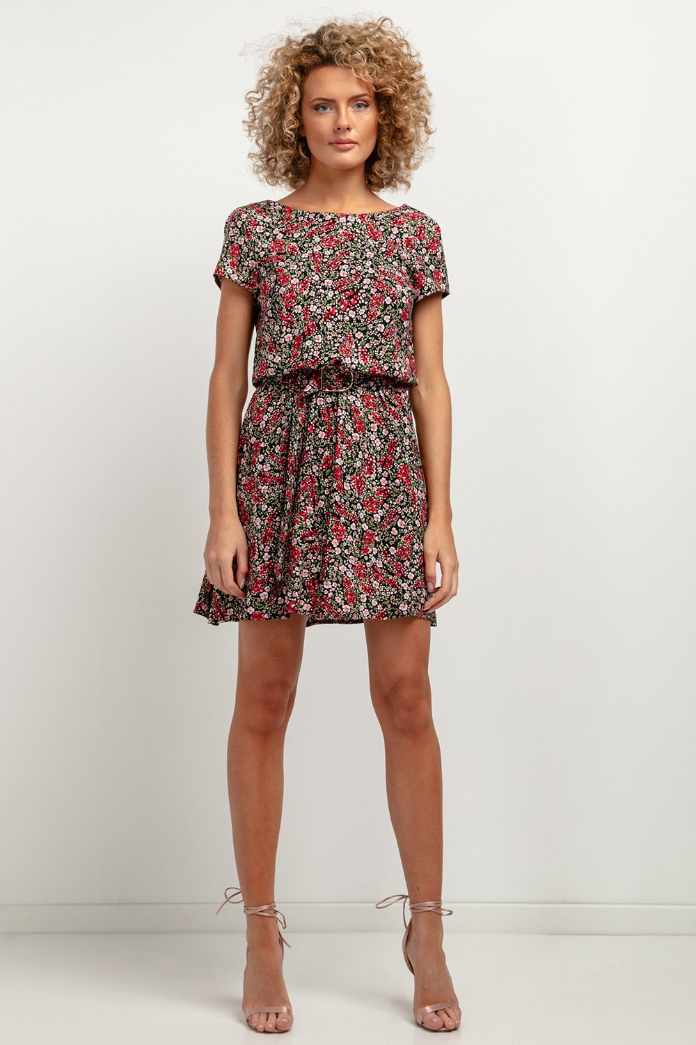 Piękna sukienka to świetna propozycja do zarówno eleganckich jak i codziennych stylizacji. Góra sukienki ma luźny fason, typu kimono i lekko rozkloszowany dół z długością przed kolano. Piękne, kwieciste wzory i głęboko wycięty dekolt w kształcie V z tyłu przyciągają uwagę, a wiązany pasek ze złotą sprzączką podkreśla talię.