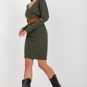 Sukienka dzianinowa z kopertowym dekoltem oraz długim rękawem. Sukienka o ołówkowym kroju z paskiem do kompletu. Na rękawach ozdobne guziki. Propozycja idealna na wiele okazji.