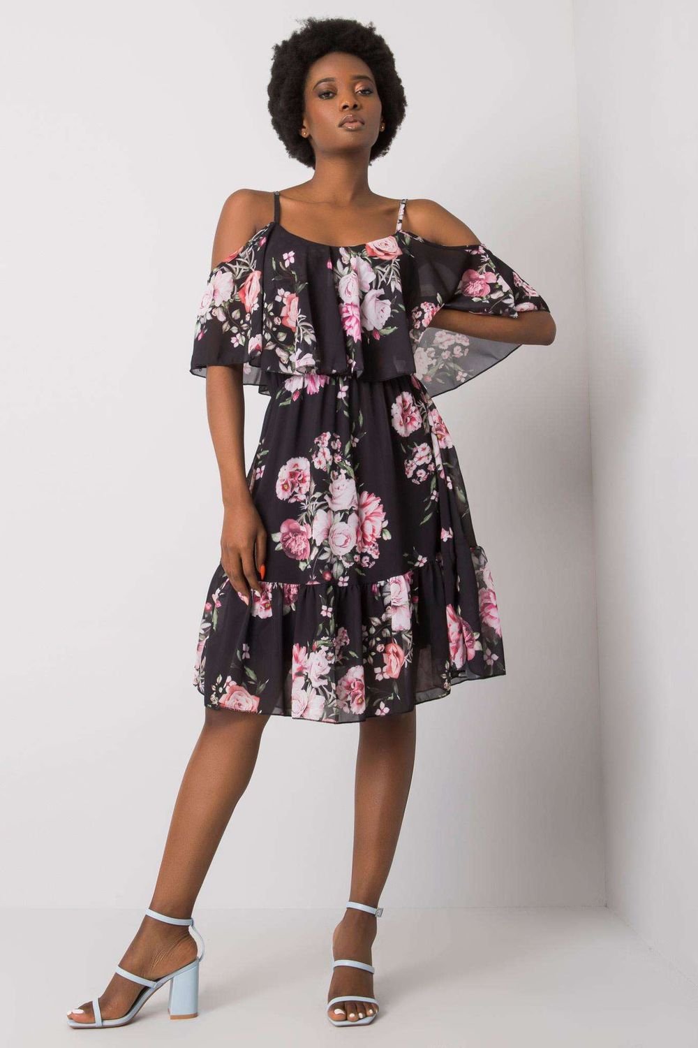 Sukienka z materiału w kwiaty, na ramiączkach z krótkimi rękawkami. Sukienka o rozkloszowanym kroju z falbanką. Idealna na wiele okazji.
