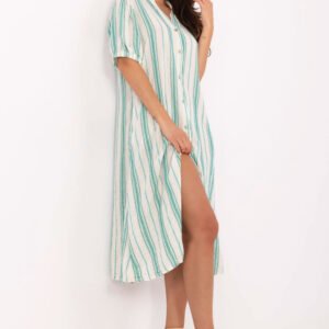 Lekka i komfortowa sukienka w stylu boho, idealna na codzienne, letnie stylizacje. Fason oversize zapewnia swobodę ruchów i wygodę noszenia, a długość midi sprawia, że świetnie sprawdzi się zarówno na plaży, jak i w mieście. Model typu koszulowego, zapinany na guziki, z dekoltem w serek, który subtelnie podkreśla szyję. Wykonana z mieszanki bawełny, poliestru i innych włókien, sukienka jest przewiewna, przyjemna w dotyku i praktyczna na ciepłe dni. Krótkie rękawy oraz luźny krój dodają jej lekkości. Całość zdobią paski oraz dekoracyjny haft, które nadają charakterystyczny, boho wygląd. Dodatkowym atutem są kieszenie ukryte w szwach bocznych, funkcjonalne i dyskretnie wkomponowane w fason. Idealna na codzienne wyjścia, spacery, wakacyjne wyjazdy czy jako stylowa narzutka plażowa.