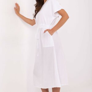 Przewiewna i wygodna letnia sukienka o rozkloszowanym fasonie, uszyta z naturalnej bawełny. Gładka tkanina zapewnia komfort noszenia i świetnie sprawdza się w codziennych stylizacjach. Model o długości midi, z krótkim rękawem i klasycznym, okrągłym dekoltem. W talii znajduje się wiązanie, które pozwala podkreślić sylwetkę i dopasować sukienkę do figury. Dodatkowym atutem są praktyczne, wsuwane kieszenie, które dodają funkcjonalności i luzu. To idealna propozycja na letnie dni na spacer, zakupy, do pracy lub spotkanie z przyjaciółmi. Uniwersalna i ponadczasowa, będzie świetną bazą do wielu stylizacji.