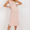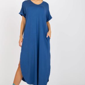 Sukienka z krótkim rękawkiem, po bokach kieszenie wsuwane. Dół zaokrąglony, z rozcięciami.