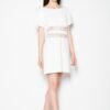 Delikatna rozkloszowana sukienka, z ozdobnymi przeszyciami na przodzie. Odcinana w pasie, rozkloszowany dół. Zapinana z tyłu na zamek.