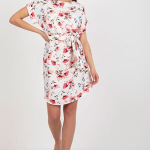 Letnia sukienka z krótkim rękawkiem oraz okrągłym dekoltem. W talii pasek do wiązania. Sukienka z materiału w ciekawym wzór kwiatowy.
