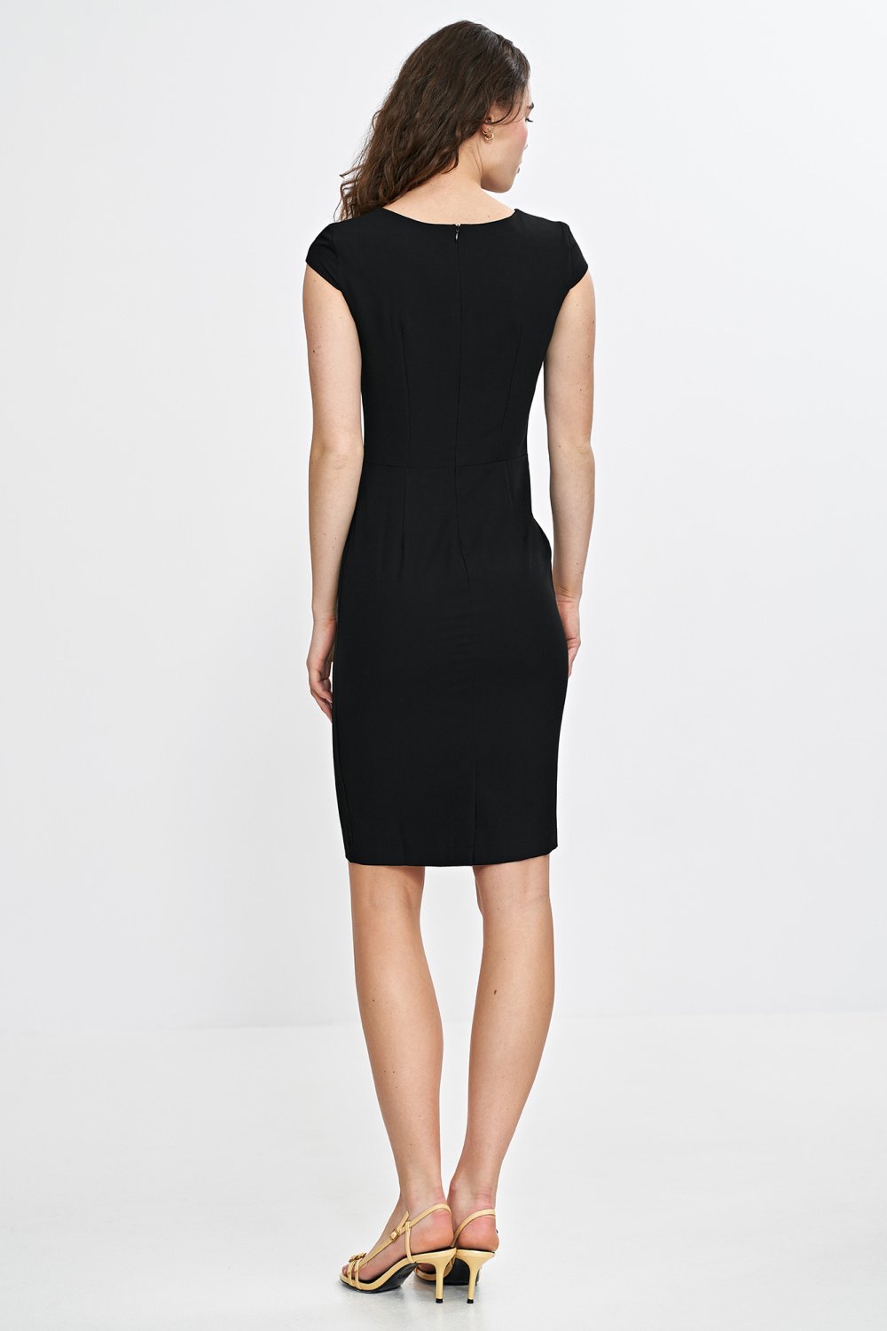 Elegancka, dopasowana sukienka o klasycznym kroju fit. Okrągły dekolt z subtelnym rozcięciem dodaje jej wyrafinowanego charakteru. Krótki rękaw typu cap delikatnie zakrywa ramiona, podkreślając kobiecą sylwetkę. Ołówkowy dół pięknie dopasowuje się do figury, a długość do kolan nadaje jej ponadczasowej elegancji. Sukienka zapinana jest z tyłu, pośrodku, na praktyczny suwak, co zapewnia komfort noszenia i idealne dopasowanie. Doskonała propozycja na wyjątkowe okazje oraz eleganckie stylizacje.