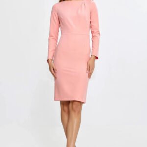 Elegancka, dopasowana sukienka o kroju fit, podkreślająca kobiecą sylwetkę. Dekolt typu łódka z subtelną zakładką po jednej stronie dodaje jej wyjątkowego charakteru. Długie rękawy nadają szyku i sprawiają, że jest idealna na chłodniejsze dni. Klasyczna długość do kolan podkreśla ponadczasowy styl. Sukienka zapinana jest z tyłu, pośrodku, na praktyczny suwak, zapewniając wygodę i perfekcyjne dopasowanie. Doskonała propozycja na eleganckie wyjścia i specjalne okazje.