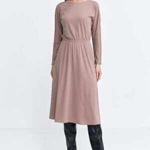 Ta uniwersalna sukienka to must-have w każdej garderobie. Wykonana z przyjemnego w dotyku modalu, zapewnia komfort noszenia przez cały dzień. Dekolt typu łódka subtelnie podkreśla szyję i ramiona, a długi, lekko nietoperzowy rękaw dodaje lekkości. Gumka w talii podkreśla sylwetkę i nadaje sukience kobiecego kształtu. Długość midi sprawia, że sukienka jest zarówno elegancka, jak i wygodna. Wkładana przez głowę, nie posiada zapięć, co dodatkowo zwiększa komfort użytkowania.