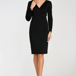 Elegancka sukienka o dopasowanym kroju (fit), wykonana z miękkiej i elastycznej dzianiny, która doskonale układa się na sylwetce. Model z kopertowym dekoltem w kształcie litery V, subtelnie podkreślającym kobiecą linię szyi i dekoltu. Sukienka posiada długie rękawy oraz ołówkową, dopasowaną część dolną, co tworzy klasyczną, ponadczasową sylwetkę. Zapinana z tyłu na kryty zamek umieszczony pośrodku, zapewnia estetyczne wykończenie. Długość do kolan sprawia, że model doskonale sprawdzi się zarówno w stylizacjach do pracy, jak i na wyjątkowe okazje.