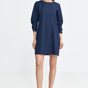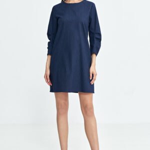 Sukienka o kroju relaxed fit, w eleganckim fasonie w kształcie litery A, który subtelnie podkreśla sylwetkę, zapewniając jednocześnie swobodę ruchu. Wykonana z materiału z delikatnie kontrastującymi prążkami typu tenis, dodaje subtelnej oryginalności. Okrągły dekolt pod szyję nadaje jej klasyczny, minimalistyczny charakter, a rękawy 3/4 z nieszablonowymi zakładkami wprowadzają modny akcent. Sukienka sięga przed kolana, co czyni ją idealną na różne okazje. Z tyłu znajduje się dyskretny suwak, ułatwiający zakładanie i zdejmowanie.
