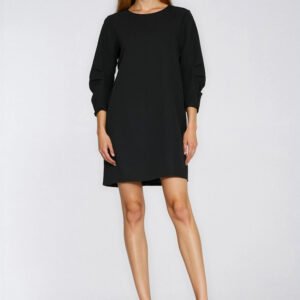Sukienka o swobodnym kroju typu relaxed fit i fasonie w literę A, który subtelnie układa się na sylwetce, zapewniając komfort noszenia. Model z okrągłym dekoltem pod szyję prezentuje się klasycznie i elegancko. Rękawy o długości 3/4 zostały wzbogacone o nieszablonowe zakładki, nadające całości oryginalnego charakteru. Długość przed kolana sprawia, że sukienka jest uniwersalna i odpowiednia na wiele okazji. Z tyłu zapinana na kryty zamek, który gwarantuje wygodę oraz estetyczne wykończenie. Idealna propozycja do stylizacji dziennych i półformalnych.