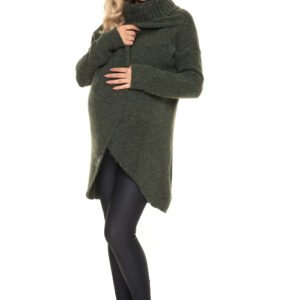 Narzutka bez zapięcia, wkładana przez głowę. Mięciutka i puchata z dodatkiem wełny. Krój asymetryczny, zakładany przód. Włochaty sweterek z luźnym golfem. Nadaje się zarówno na ciążę, jak i później. Idealny krój do karmienia.