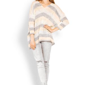 Luźny krój typu oversize. Sweter w trójkolorowe paski. Dekolt w szpic. Dekolt V na plecach.