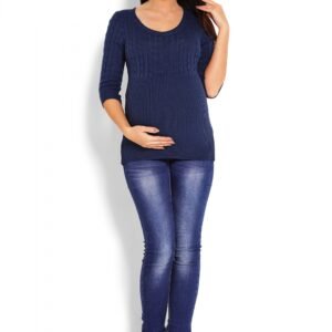 Sweter o delikatnym splocie. W górnej części warkoczyki. Sweter z rękawem 3/4 oraz okrągłym dekoltem.