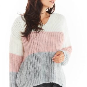Trójkolorowy sweter z dekoltem w serek ze ściągaczami przy rękawach. Jego kolory i ponadczasowy krój sprawdzi się przy wielu stylizacjach.