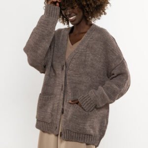 Kardigan zapinany na guziki z wełną o basicowym kroju. Propozycja dla kobiet ceniących prostotę, miękkość i funkcjonalność. Uszyty w Polsce z dbałością o detale. Basicowy krój z dekoltem V, zapięciem na guziki i kieszeniami płynnie przechodzi między casualem a smart casualem. Miękka dzianina z dodatkiem wełny otula i grzeje w sezonie jesień-zima.