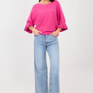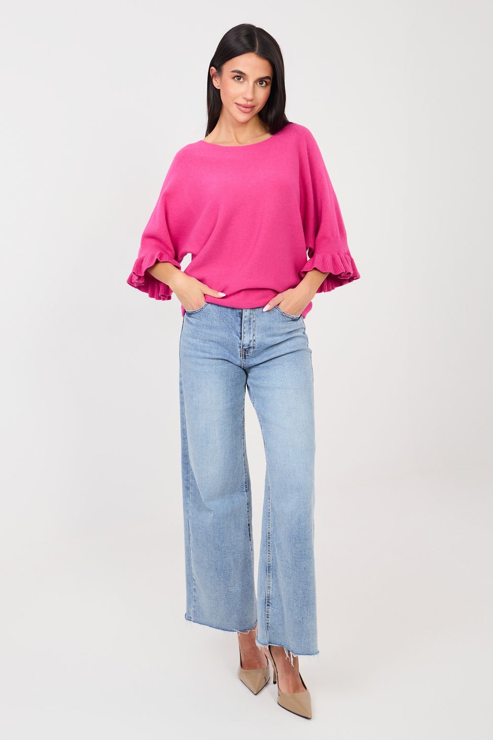 Elegancki damski sweter o standardowej długości, idealny zarówno na co dzień, jak i na bardziej wyjątkowe okazje. Wykonany z wysokiej jakości mieszanki wiskozy, poliestru i nylonu, zapewnia komfort noszenia oraz trwałość. Gładki wzór nadaje mu ponadczasowy charakter, a subtelne detale dodają kobiecego uroku. Model wyróżnia się okrągłym dekoltem oraz rękawami 3/4 zakończonymi delikatną falbaną, które podkreślają elegancję i lekkość stylizacji. To doskonały wybór dla kobiet ceniących klasykę w nowoczesnym wydaniu.