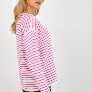 Sweter damski o klasycznym kroju w kolorowe paski, z długim rękawem oraz okrągłym dekoltem.