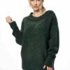 Luźny sweter, z dekoltem w łódkę, na rękawach kolorowe paski.