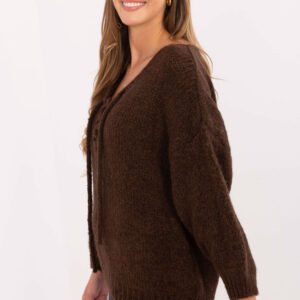 Stylowy sweter damski o casualowym charakterze to idealny wybór na co dzień. Wykonany z miękkiej i przyjemnej w dotyku mieszanki akrylu, poliamidu, wiskozy i wełny, zapewnia komfort oraz ciepło w chłodniejsze dni. Model ma standardową długość i długie rękawy, a jego gorsetowe wiązanie z przodu nadaje mu oryginalnego, kobiecego charakteru. Gładki wzór sprawia, że sweter łatwo dopasować do różnych stylizacji świetnie wygląda zarówno z jeansami, jak i ze spódnicą. To doskonała propozycja na codzienne, niezobowiązujące okazje, kiedy chcesz połączyć wygodę z modnym wyglądem.