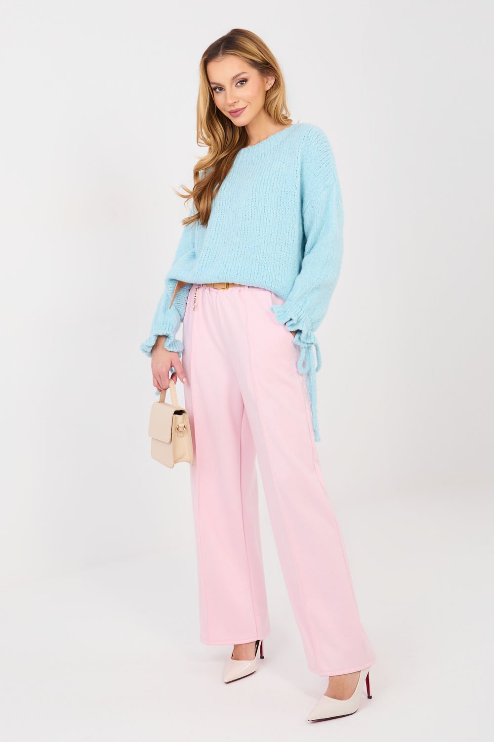 Damski sweter o casualowym charakterze, idealny do codziennych stylizacji oraz do pracy. Model o standardowej długości, wykonany z miękkiej i przyjemnej w dotyku mieszanki akrylu, poliamidu, wiskozy oraz wełny, która zapewnia komfort noszenia i ciepło. Gładki wzór nadaje swetrowi uniwersalnego wyglądu, dzięki czemu łatwo dopasować go do różnych elementów garderoby. Klasyczny, okrągły dekolt i długie rękawy podkreślają ponadczasowy fason. Ozdobne falbany z wiązaniem przy rękawach dodają całości kobiecego uroku i subtelnej oryginalności. Sweter nie posiada zapięcia, co zapewnia wygodę i swobodę noszenia.