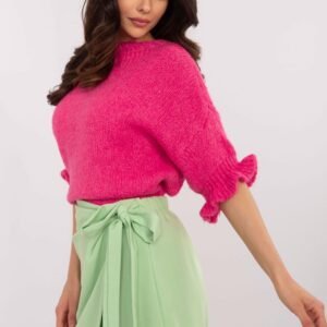Stylowy damski sweter o casualowym charakterze to doskonały wybór na co dzień i do pracy. Wykonany z miękkiej mieszanki akrylu, wełny, poliamidu i wiskozy, zapewnia ciepło i komfort noszenia. Posiada klasyczną, standardową długość oraz elegancki okrągły dekolt, który subtelnie podkreśla szyję. Rękawy o długości 3/4 zdobią delikatne falbanki, dodające całości kobiecego uroku. Gładka faktura materiału sprawia, że sweter jest uniwersalny i łatwy do stylizacji, idealny zarówno do eleganckich spodni, jak i codziennych jeansów.