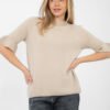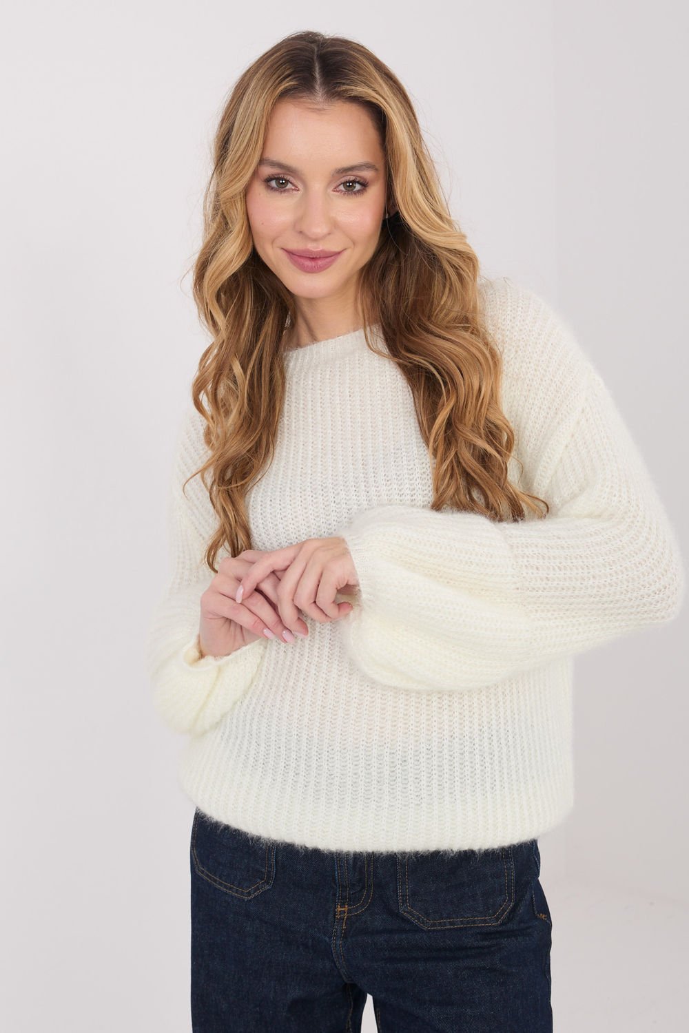 Damski sweter o casualowym charakterze, idealny do codziennych stylizacji oraz do pracy. Model wykonany z miękkiej i przyjemnej w dotyku mieszanki akrylu, moheru oraz wełny, która zapewnia ciepło i komfort noszenia. Gładki wzór nadaje swetrowi uniwersalnego i ponadczasowego wyglądu. Standardowa długość, klasyczny okrągły dekolt oraz brak zapięcia sprawiają, że sweter jest wygodny i łatwy do stylizacji. Długie, bufiaste rękawy dodają całości kobiecego uroku i modnego charakteru, subtelnie wyróżniając model na tle klasycznych fasonów.