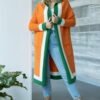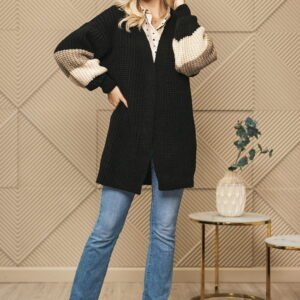 Gustowny kardigan o luźniejszym kroju, bez zapięcia z długim rękawem. Na rękawach kontrastowe paski.