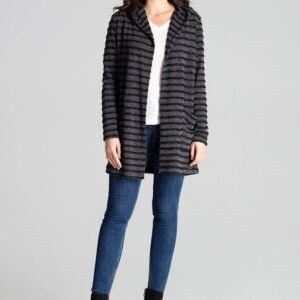 Czarny długi sweter z dzianiny w ozdobne poziome paski z kapturem. Z przodu naszyte duże kieszenie, bez zapięcia.