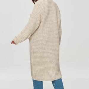 Długi kardigan damski o kroju oversize to idealna propozycja dla kobiet ceniących wygodę. Sweter sięga poniżej kolan, co nadaje mu nieco eleganckiego charakteru. Kardigan ma szerokie, długie rękawy zakończone ściągaczami, które pozwalają na regulację ich długości. Materiał przyjemny, z wyraźnym prążkowanym splotem, co podkreśla jego miękkość i ciepło. Sweter nie posiada zapięcia, co uwydatnia jego swobodę, a także szerokie kieszenie po bokach, które są praktyczne i stylowe. Taki kardigan idealnie nadaje się na chłodniejsze dni i stanowi doskonałą bazę na komfortowy i stylowy look, zarówno do pracy jak i na wyjście z przyjaciółmi.