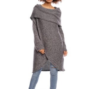 Długi sweter z szerokim, luźnym golfem o asymetrycznym, zakładanym przodzie to elegancka i niepowtarzalna propozycja dla kobiet ceniących sobie wygodę, ciepło i niebanalny wygląd. Sweter można nosić samodzielnie lub jako dodatkowe okrycie. Narzutka wykonana z miękkiej i puchatej przędzy, wkładana przez głowę.