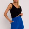 Krótki fason, naturalna tkanina i przemyślane detale, te szorty to idealne połączenie wygody i casualowej elegancji. Uszyte z bawełnianej tkaniny o matowym wykończeniu, zapewniają komfort noszenia nawet w najcieplejsze dni. Model z wysokim stanem i elastycznym tyłem pasa, z przodu uzupełniony ozdobnymi zakładkami, które subtelnie podkreślają talię. Szorty zapinane są na kryty zamek oraz dwa dyskretne guziki, co gwarantuje wygodne i estetyczne dopasowanie. Po bokach znajdują się praktyczne, wsuwane kieszenie, a lekko rozszerzane nogawki nadają sylwetce lekkości. Zaprojektowano i uszyto w Polsce, z myślą o funkcjonalności i stylu.