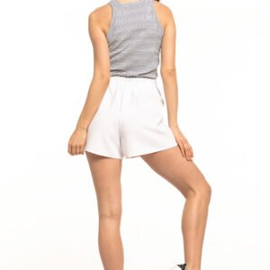 Letnie spodenki z dwiema kieszeniami. Spodenki mają elastyczną wstawkę z tyłu paska dla lepszego dopasowania i łatwiejszego noszenia. Z przodu dwie zakładki i pasek do wiązania lub pozostawienia luźno. Nasza propozycja na ciepłe wiosenne i letnie dni.