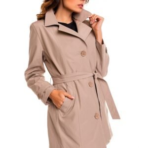 Klasyczny bawełniany trencz damski na podszewce, doskonały na jesienne kaprysy pogody. Płaszczyk sznurowany w pasie i zapinany na trzy duże guziki. Mankiet zdobiony listwą. Podszewka poliestrowa.