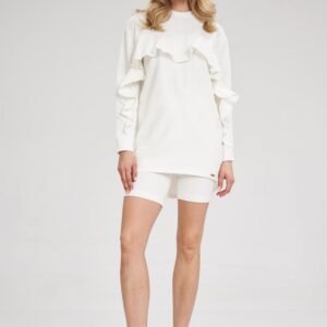Prosta bawełniana tunika, długi rękaw ozdobiony falbaną, która przechodzi nad linię biustu. Dekolt pod szyję. Dłuższy półokrągły tył.