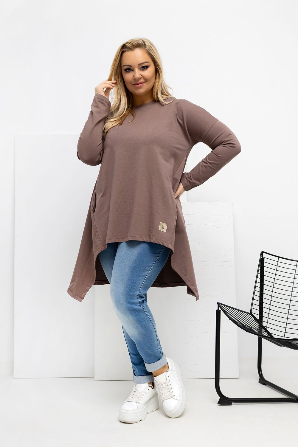 Stylowa tunika plus size o przedłużonym, asymetrycznym kroju to doskonała propozycja dla kobiet ceniących komfort i nowoczesny wygląd. Wykonana z miękkiego, przyjemnego w dotyku materiału, pięknie układa się na sylwetce, zapewniając swobodę ruchów i subtelne wysmuklenie figury. Model łączy w sobie fason tuniki i sukienki asymetrycznej, dzięki czemu świetnie sprawdzi się zarówno do legginsów, jak i jako samodzielna, luźna sukienka. Dekolt klasyczny, okrągły podkreśla szyję i pasuje do każdej stylizacji. Rękaw długi, idealny na chłodniejsze dni. Praktyczne kieszenie ukryte w bocznych szwach, które dodają wygody i funkcjonalności. Na przodzie, na dole, znajduje się mała naszywka, nadająca całości modnego charakteru. Tunika jest wkładana przez głowę, co zapewnia szybkie i wygodne zakładanie. Nowoczesna, komfortowa i stylowa, świetnie uzupełni codzienne stylizacje, a jej przedłużony, asymetryczny krój doskonale podkreśli atuty sylwetki plus size.