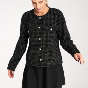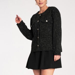 Klasyczny żakiet w kratę ala Chanell. Żakiet z fakturowanego materiału w stylu tweedowym. Zapinany na złote, ozdobne guziki. Z naszytymi wsuwanymi kieszeniami.