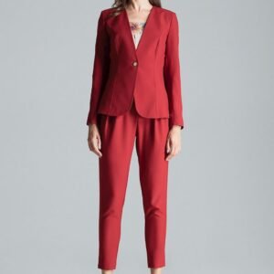 Bordowy klasyczny żakiet bez klap, zapinany na jeden guzik, podkreślający talię, bez kieszeni, z podszewką.