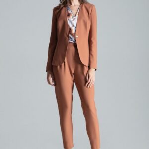 Brązowy klasyczny żakiet bez klap, zapinany na jeden guzik, podkreślający talię, bez kieszeni, z podszewką.